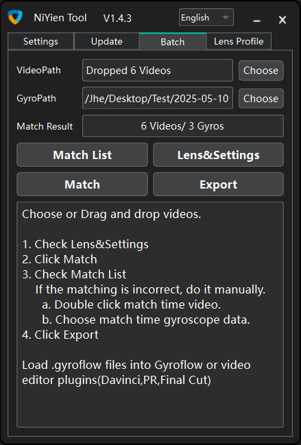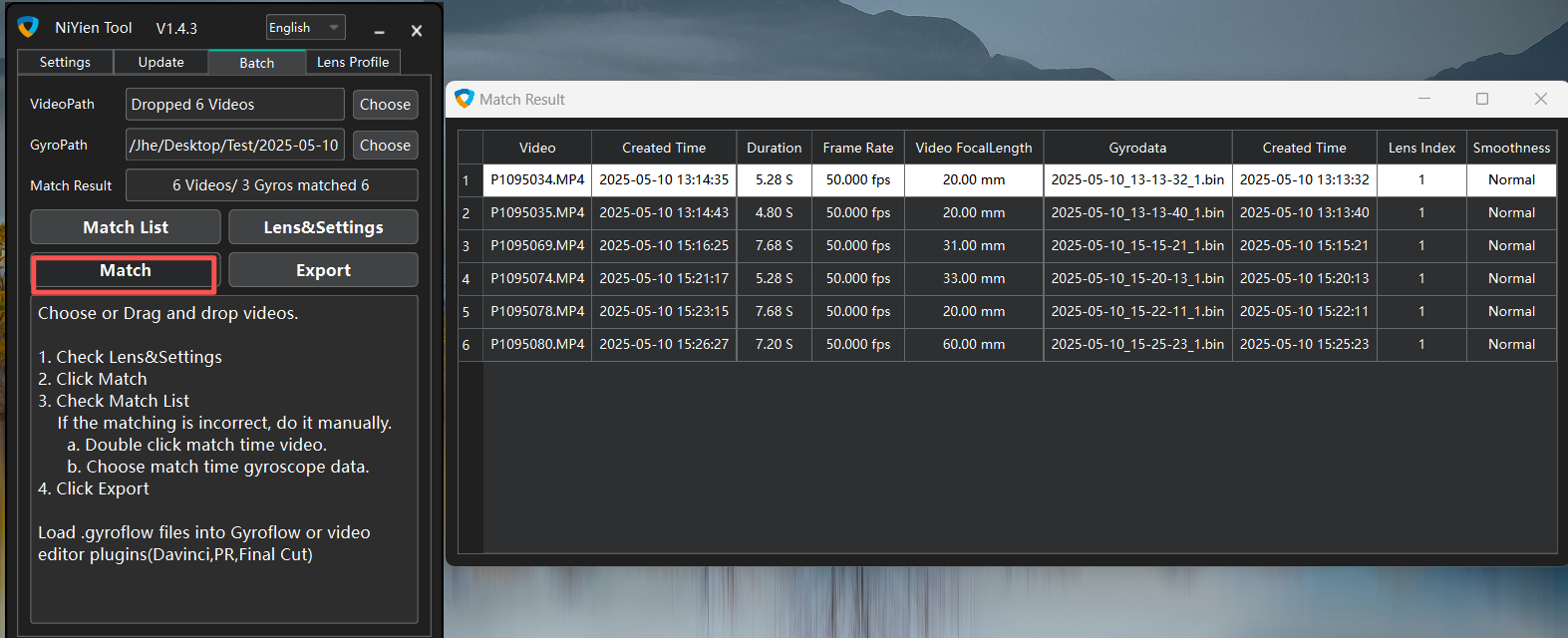 Drag the video and gyro data into the NiYienTool, and do not click Match