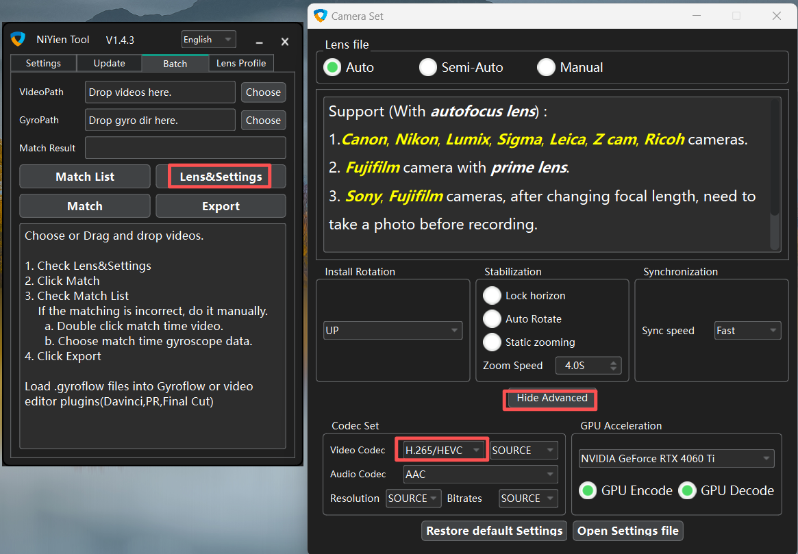 Symptom: NiYien Tool exits quickly or prompts that the correct Gyroflow version is not installed